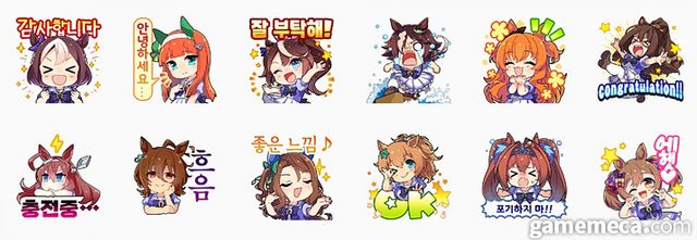 14일 출시된 ‘우마무스메 프리티 더비 제 1 레이스’는 첫 영구 소장이 가능한 이모티콘으로, 스페셜 위크부터 히시 아마존, 보드카 등 애니메이션에 등장하는 다양한 우마무스메들의 24종 감정 표현으로 구성됐다. 여기에 ‘마블러스!’, ‘맞짱이다!’ ‘충전 중…’ 등 실제로 등장했던 각 캐릭터들의 대사를 적절히 녹여냈다.