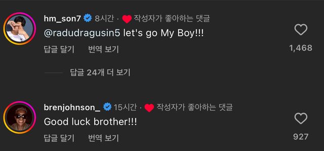 손흥민은 드라구신의 게시물에 "Let's go my boy(가자 내 친구야)"라며 애정이 담긴 댓글을 통해 팀원을 챙기는 모습을 보였다. 존슨도 "Good luck brother!(형제여 행운을 빈다)"라며 그의 대회를 응원했다.