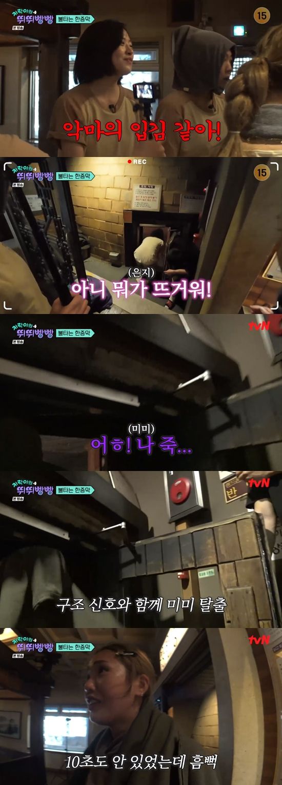 미미는 10초도 버티지 못하고 "어! 나 죽.."이라며 말을 잇지 못하고 탈출했다. 미미는 "사람이 할 수 있는 거냐"고 황당해했다.
