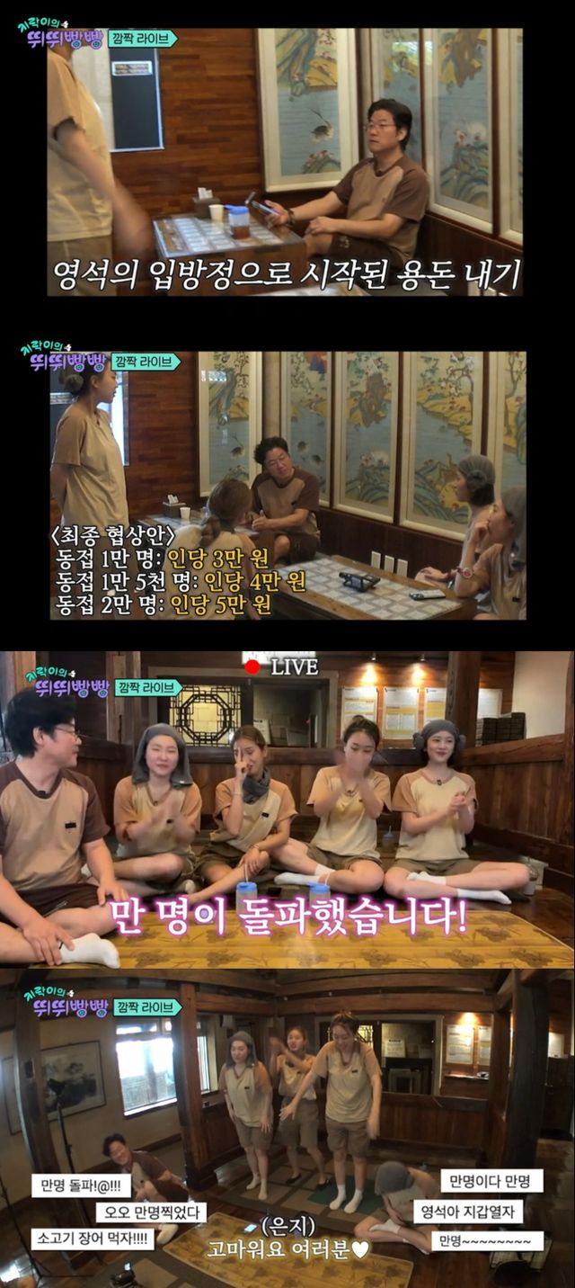 이날 호캉스 숙소 도착 전 이은지, 미미, 이영지, 안유진은 찜질방에 방문했다. 나영석 PD는 “이거 만약에 (라이브) 동시 접속자 1만 명 넘는다? 만 원”이라고 제시했다. 이영지가 “인당 만원도 아니고”라고 불만을 표현하자 나영석은 “1만 명은 인당 3만 원, 1만 5000명은 인당 4만 원, 2만 명은 인당 5만 원 주겠다”고 협상했다.