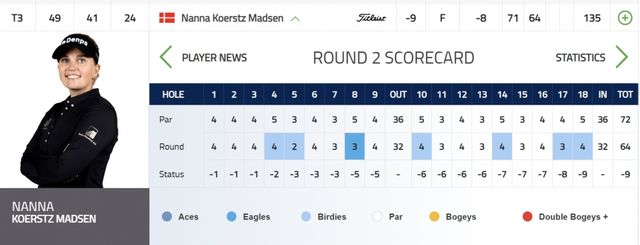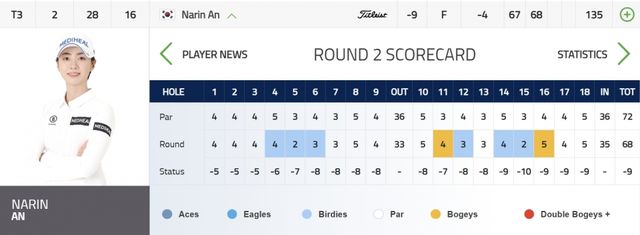 안나린은 이날 4타를 줄여 합계 9언더파 135타를 쳐 나나 코에르츠 매드센(덴마크)와 공동 3위에 올랐다. 이날 9타를 몰아치며 그레이스 킴(호주)와 공동선두에 오른 앨리 유잉(미국)과는 2타 차다.