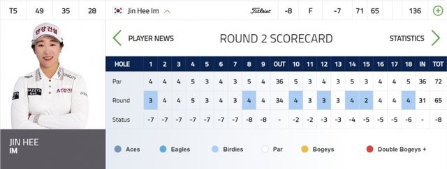 임진희는 이날 보기 없이 버디만 7개를 골라내 합계 9언더파 135타를 쳐 전날 공동 49위에서 브룩 헨더슨(캐나다) 등과 공동 5위로 껑충 뛰었다.