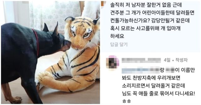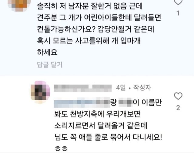 이후 B씨가 댓글을 통해 "솔직히 (영상 속의) 저 남자분 잘한 거 없음. 근데 견주분 그 개가 어린아이들한테 달려들면 컨트롤 가능하시냐. 감당 안 될 거 같은데 혹시 모르는 사고를 위해 개 입마개 해라"라고 말했다.