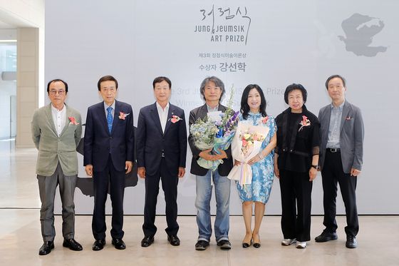▲ 왼쪽부터 노중기(대구미술관장), 김정길(대구문화예술진흥원장), 임인환(대구시의원), 강선학(수상자), 정영주(도솔문화원장), 윤순영(도솔문화원이사), 정윤(유족대표) |