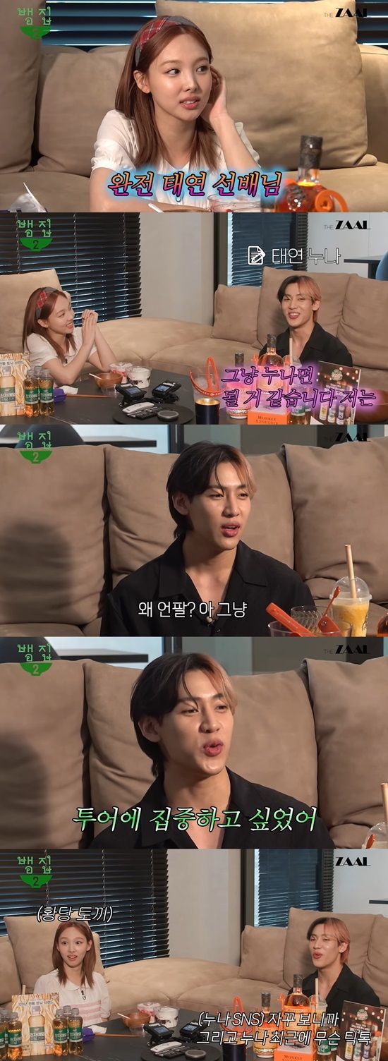 여전한 뱀뱀의 팬심을 확인한 스태프는 뱀뱀에게 왜 태연 계정을 언팔했는지 물었다. 이에 뱀뱀은 "투어에 집중하고 싶었다. 누나 (SNS) 올라오면 자꾸 보니까"라며 "누나가 최근에 무슨 챌린지 하는데 (내가) 자꾸 보더라. 그래서 언팔했다. 집중하려고"라며 투어에 집중하기 위해 SNS까지 언팔했다는 상상도 못한 이유를 밝혀 놀라움을 안겼다. 이를 듣던 나연 역시 뱀뱀을 신기하게 바라봐 웃음을 더했다.