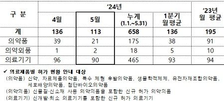 식품의약품안전처(처장 오유경)가 지난 5월 한달간 의료제품 총 113개 품목을 허가했다고 밝혔다.