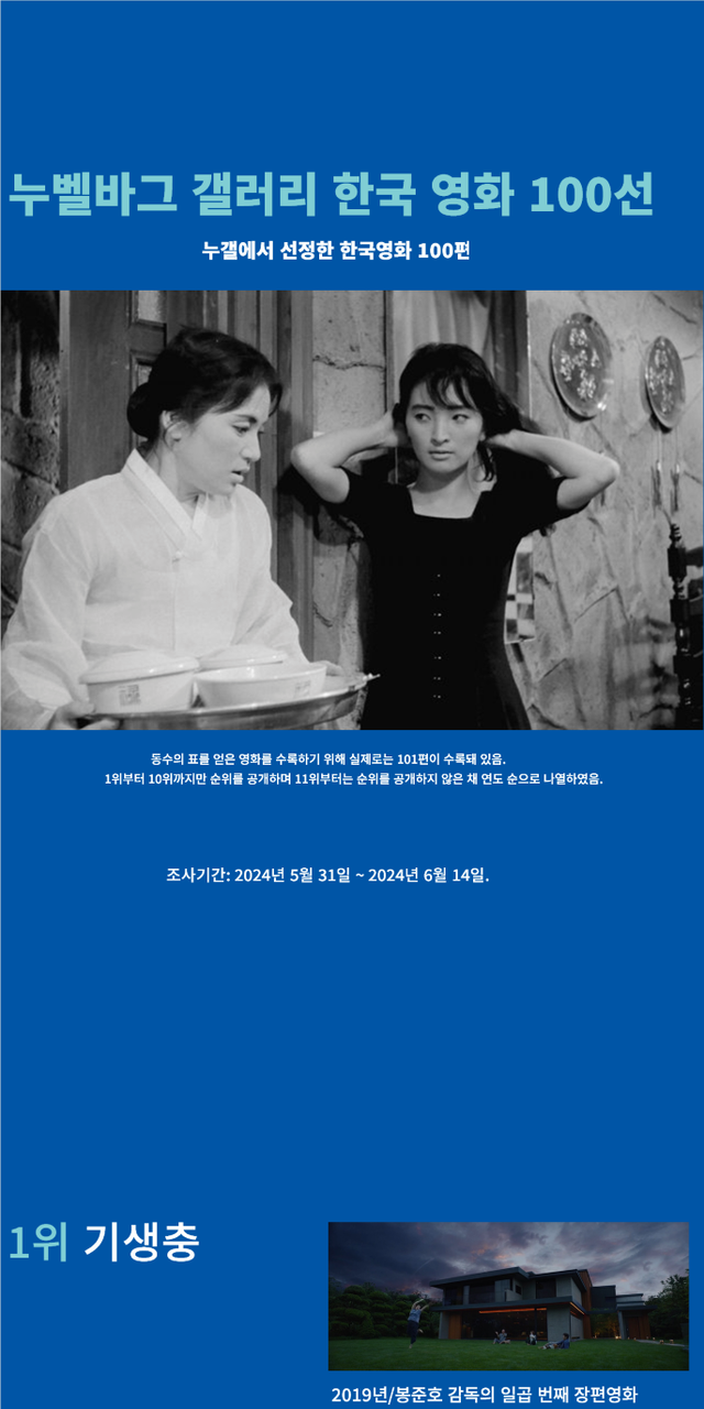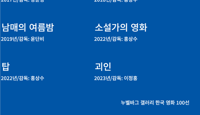 한국 영화 100선은 누벨바그 갤러리가 선정한 작품들로, 한국 영화의 역사와 문화를 대표하는 영화들을 포괄적으로 소개합니다. 이 리스트는 영화 전문가와 평론가들의 의견을 반영하여 구성되었으며, 한국 영화의 다양한 면모를 만날 수 있는 기회입니다.
