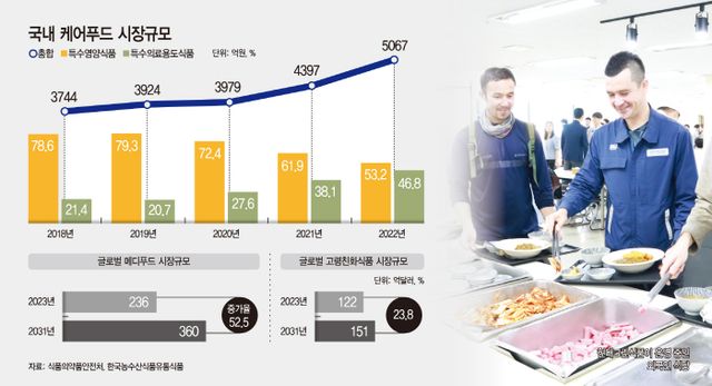 국내 케어푸드 시장 규모가 2조5000억원(2021년)에서 3조원(2025년)으로 확대될 것으로 관측되고 있어, 경쟁사들도 앞다퉈 케어푸드 시장에 눈독을 들이고 있다. 올 1분기 현대그린푸드의 케어푸드 매출은 전년 대비 23% 증가했다.