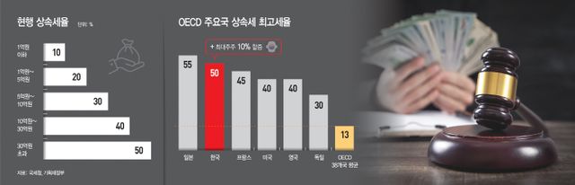 16일 관가와 국회 등에 따르면 이번 주 열릴 예정인 국민의힘 재정·세제개편특별위원회의 2차 회의에서는 상속세 개편과 관련해 우선 과표 구간 상향 조정이 추진될 전망이다. 현재 상속세는 과표구간별로 △1억원 이하 10% △1억~5억원 20% △5억~10억원 30% △10억~30억원 40% △30억원 초과분 50%의 세율이 각각 부과된다.