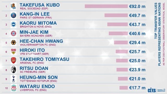 가파른 상승 곡선을 그리면서 아시아 몸값 1위가 됐다. 지난 시즌 다소 아쉬운 활약을 보였음에도 국제축구연맹(FIFA) 산하 국제스포츠연구센터(CIES)는 쿠보 가치를 9,200만 유로(약 1366억 원)로 평가했다. 이강인, 미토마 카오루, 김민재, 황희찬, 이토 히로키, 토미야스 타케히로, 도안 리츠, 손흥민, 엔도 와타루가 뒤를 이었다. 이강인은 2위, 김민재는 4위, 황희찬은 5위, 손흥민은 9위였다.
