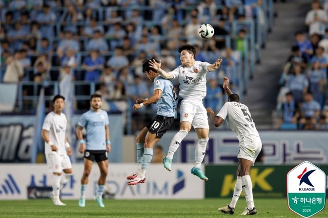 K리그1 17라운드 대구와 제주의 경기에서 헤더 경합하는 대구 고재현과 제주 제갈재민. 한국프로축구연맹 제공