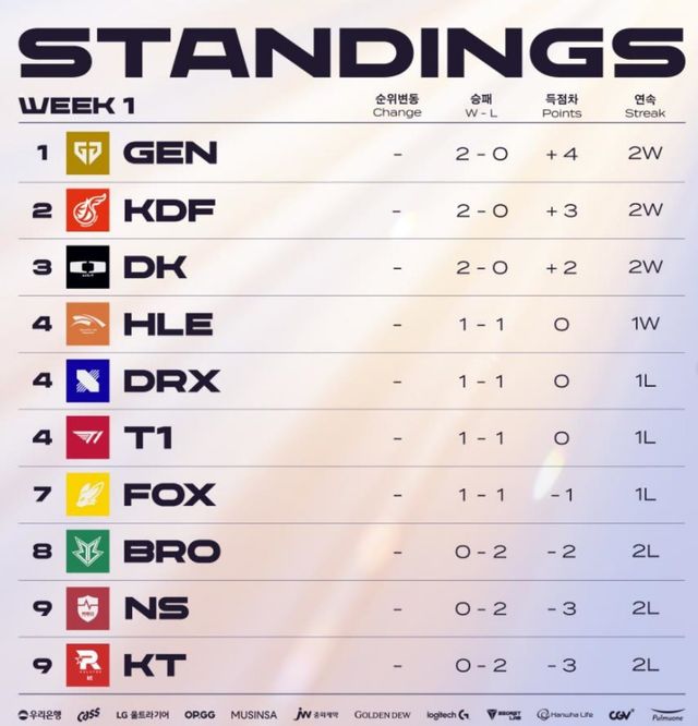 두 경기 모두 2:0으로 완승을 거둔 젠지는 현재 단독 1위로 치고 나갔다.