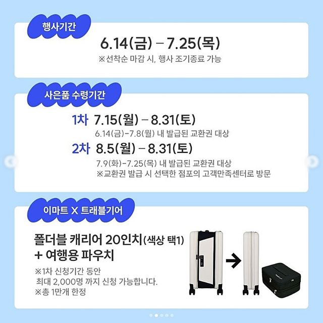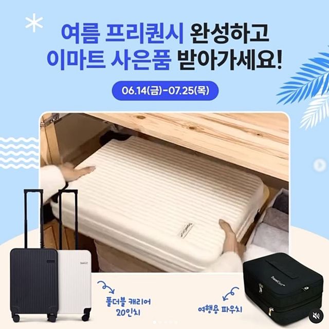 이번 이마트 '여름 프리퀀시' 행사의 사은품은 14만 원 상당의 트래블기어 폴더블 캐리어(20인치, 블랙·화이트 색상)와 여행용 파우치(블랙 색상)이다.