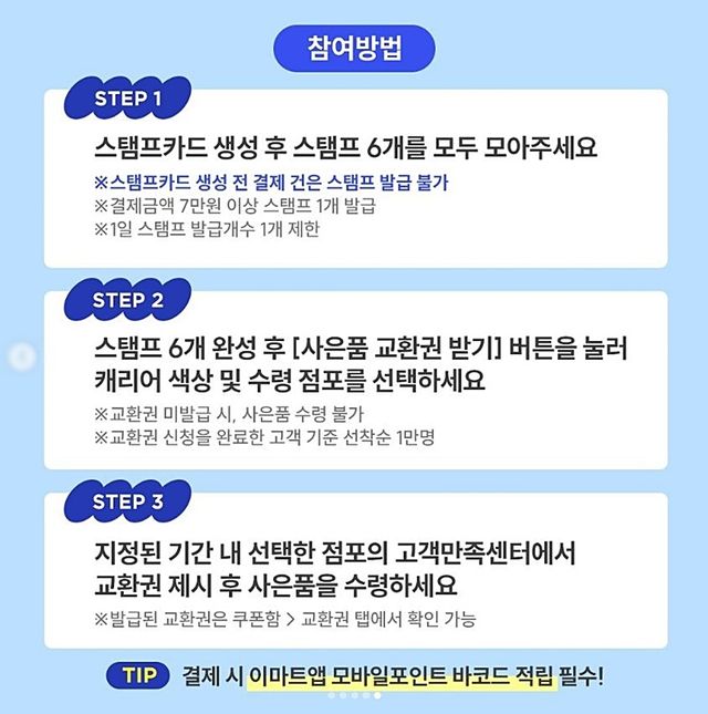 이마트는 이 기간 총 6개의 스탬프를 모은 고객 1만 명에게 선착순으로 사은품을 제공한다고 밝혔다.