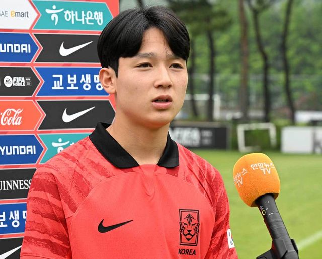 17세 이하(U-17) 남자 축구대표팀 미드필더 양민혁이 2023년 6월 7일 오후 경기도 파주 축구국가대표트레이닝센터(NFC)에서 열린 미디어데이에서 취재진과 인터뷰를 하고 있다. / 뉴스1