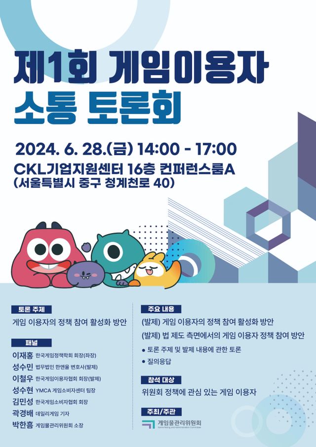 게임물관리위원회는 28일 오후 2시부터 서울 CKL기업지원센터 16층에서 ‘게임 이용자의 정책 참여 활성화 방안’을 주제로 토론회를 개최한다고 밝혔다. 게임 이용자와의 첫 소통 토론회다.