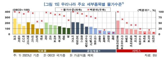 더 구체적으로 세부품목의 OECD 평균 대비 가격수준을 보면, 사과는 3배 가까이 비쌌고 돼지고기와 감자는 두 배를 넘었다. 티셔츠, 남자정장 가격, 골프장이용료 역시 OECD 평균의 두 배를 넘었다.