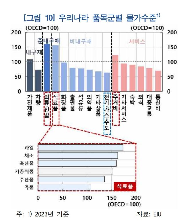 한은의 연구 결과를 보면, OECD 평균(100) 대비 한국의 의류·신발은 150이 훌쩍 넘었고 식료품도 150이 넘었다. 즉 OECD 평균의 1.5배를 넘을 정도로 이들 품목의 가격이 상대적으로 비쌌다.
