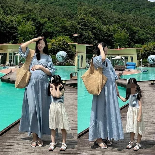 사진 속 이다은 딸 리은 양과 함께 풀장을 배경으로 서있는 모습이다. 그는 파란색 원피스에 흰색 샌들을 매치해 시원한 바캉스 룩을 완성했다. 곧 출산을 앞둔 만삭 상태임에도 불구하고 갸름한 턱선을 자랑하고 있어 눈길을 끈다.