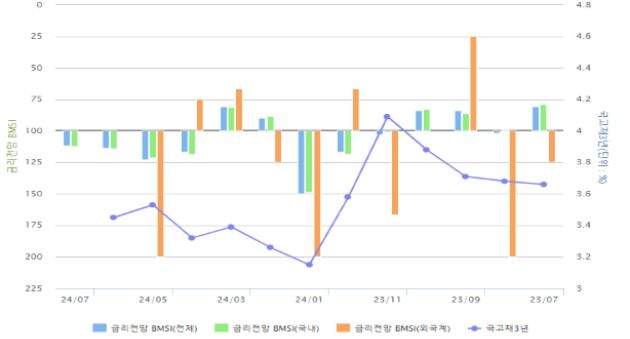 금융투자협회가 21일 발표한 '7월 채권시장지표(BMSI)'에 따르면 금리전망 BMSI는 112.0으로 6월(114.0)보다 2포인트 하락하며 전월과 비슷한 수준을 지속하고 있다.