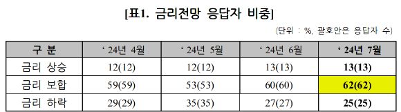 설문에 참여한 전문가 중 62%가 7월 금리는 보합세를 보일 것이라고 응답했다. 이는 전월 60% 대비 소폭 상승한 수치다.