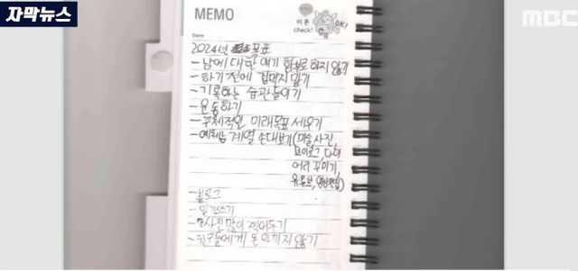 지난 20일 MBC가 공개한 A씨의 수첩에는 ‘2024년 목표’로 ‘하기 전에 겁먹지 말기’, ‘구체적인 미래 목표 세우기’ 등이 적혀 있었고 월급과 생활비, 적금에 대한 계획도 담겨 있었다. 또 군대에 가기 전에 모아야 할 돈도 정해 써놨다.