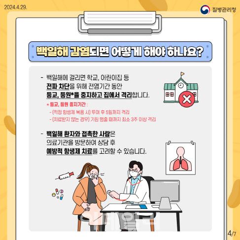백일해(百日咳)는 ‘100일 동안 기침이 지속된다’는 뜻에서 지어진 이름입니다. 보르데텔라 균에 감염돼 발생하는 제2급 법정 감염병으로, 영유아 10대 사망 원인 중 하나로 꼽히기도 합니다. 잠복기는 평균 7~10일로 알려져 있으며, 이름이 의미하듯 발작성 기침이 지속되는 것이 대표적인 특징입니다. 발열은 심하지 않지만 기침이 심하고, 특히 밤에 기침 증상이 심하게 나타납니다. 숨을 들이쉴 때 훕하는 높은 소리가 나는 것도 특징입니다.