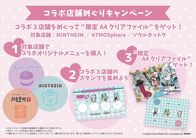 각 매장은 오는 8월 12일까지 하츠네 미쿠의 오리지널 일러스트로 제작한 한정판 노벨티와 컬래버 메뉴를 함께 선보인다. 오리지널 일러스트는 일본 유명 일러스트레이터 하므네즈코, DS마일, 사쿠라기렌 3명이 참여해 제작했다. 여기에 신작 오리지널 일러스트를 활용한 한정판 하츠네 미쿠 굿즈와 포토 부스도 만나볼 수 있다.