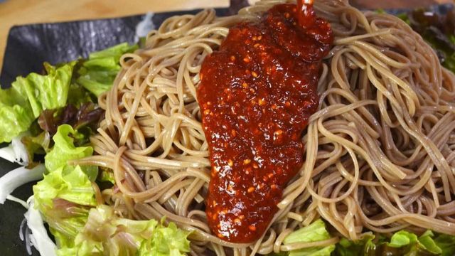 다음은 냄비에 물을 넣어 끓이고, 메밀면 300g을 넣어 4분 삶은 뒤 찬물에 헹군다. 면을 찬물에 빨래하듯 비벼 전분기를 없애준다. 헹군 뒤에는 물기를 잘 제거해 준다.