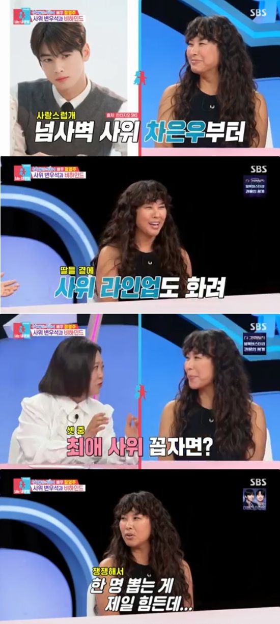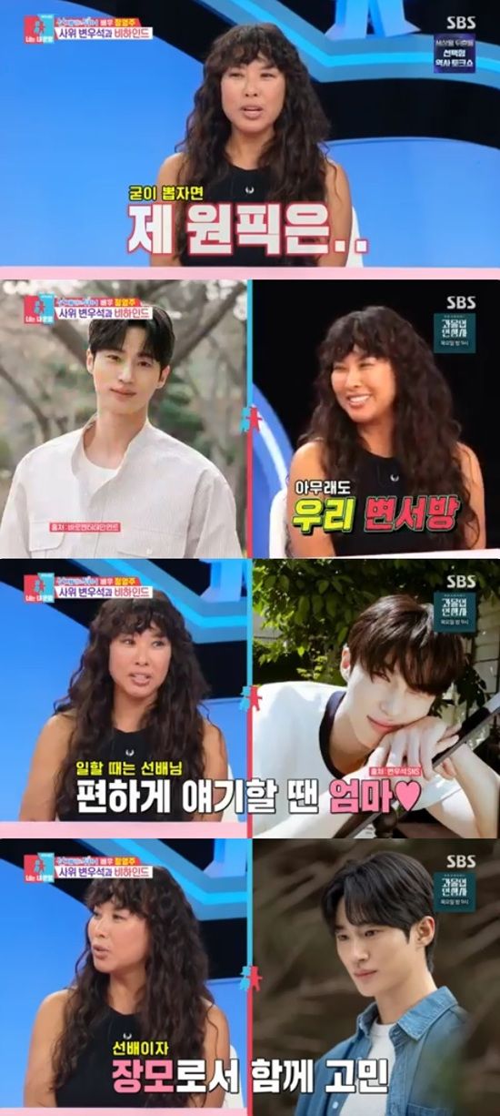정영주는 김숙이 최애 사위를 물어보자 "너무 쟁쟁해서 한 명 뽑는 게 힘든데 가장 최근이고 하니까 우리 변서방이"라고 변우석을 지목했다.