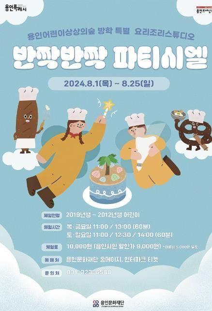 [와이뉴스] 용인문화재단은 용인어린이상상의숲 요리조리스튜디오에서 진행하는 여름방학 맞이 어린이 베이킹 체험 프로그램 ‘반짝반짝 파티시엘’의 예매를 오는 26일 오후 2시에 오픈한다.