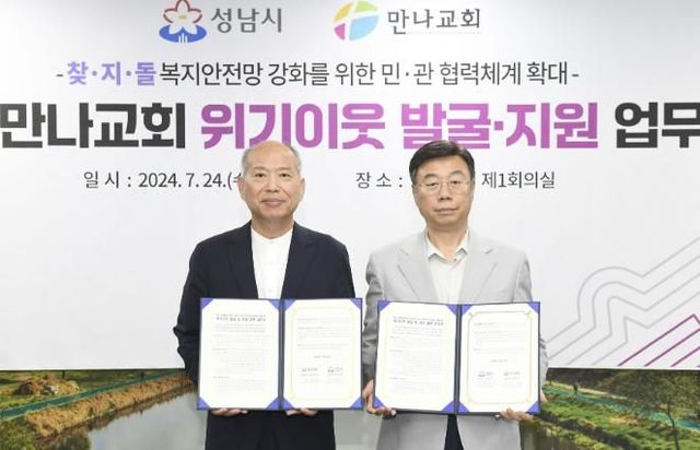 시는 전날 오후 5시 시청 4층 제1회의실에서 신상진 성남시장과 김병삼 만나교회(분당구 야탑동) 담임목사 등이 참석한 가운데 위기 가구 발굴 지원을 위한 업무협약을 체결했다.