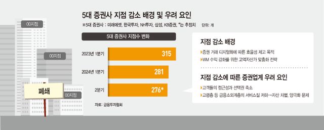 25일 금융투자업계에 따르면 올해 2분기 5대 증권사(미래에셋·한국투자·NH투자·삼성·KB증권)들의 지점 수는 276곳으로 추정된다. 1분기 281곳에서 5곳 줄어든 수준이다. NH투자증권이 지난 5월 반포와 방배 센터를 통합, 미래에셋증권이 지난달 김해·마산·경산·경주 지역 지점을 통폐합한 게 반영됐다. KB증권의 경우, 지점이 아닌 라운지(방배·서초·올림픽·스타시티·충무로역·역삼동) 6곳을 폐쇄했다.