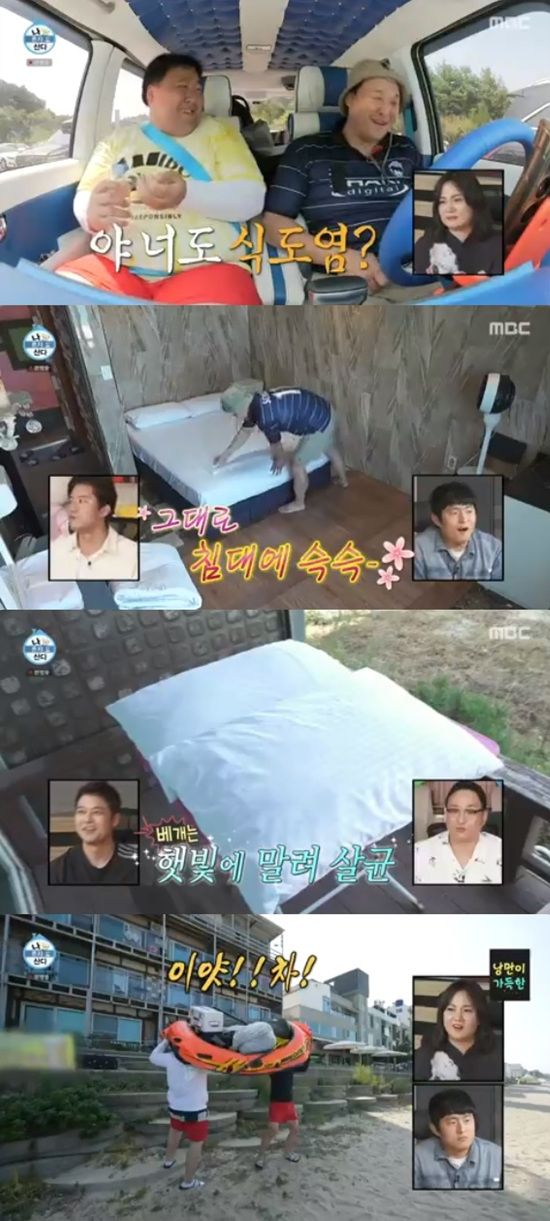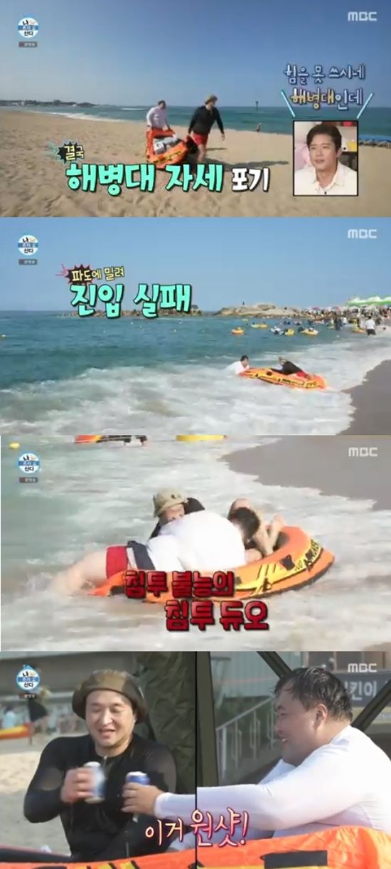 구성환과 전재규는 커플 수영복으로 갈아입고 해변가로 향했다. 두 사람은 해병대 자세로 고무보트를 들고 움직이려다가 포기, 고무보트를 질질 끌고 갔다.