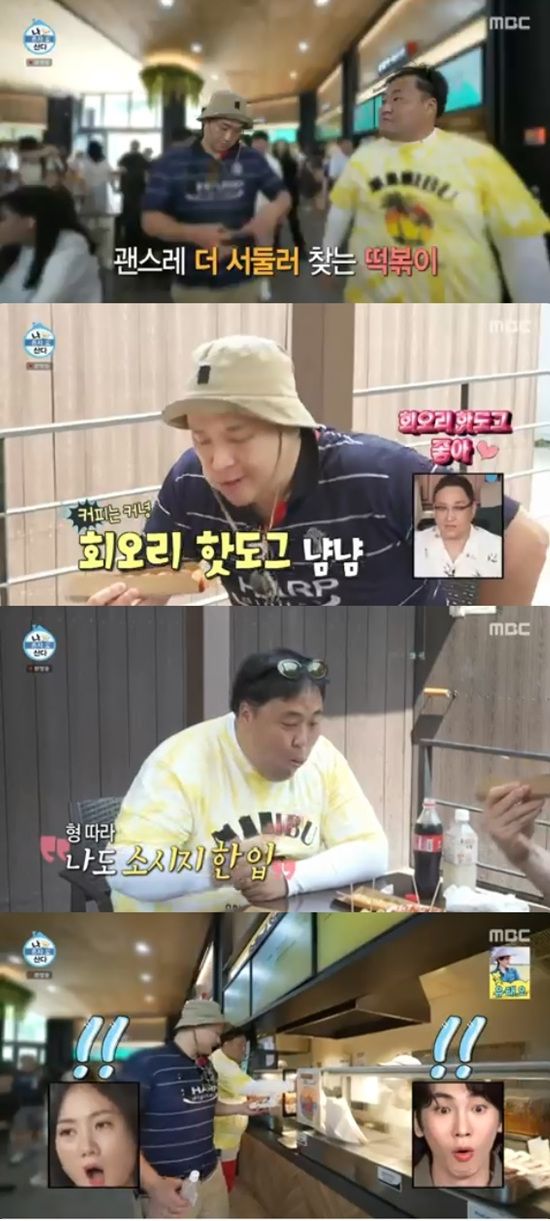 구성환과 전재규는 차로 돌아가기 전 차에서 먹을 맥반석 오징어구이와 호두과자를 추가로 더 샀다.