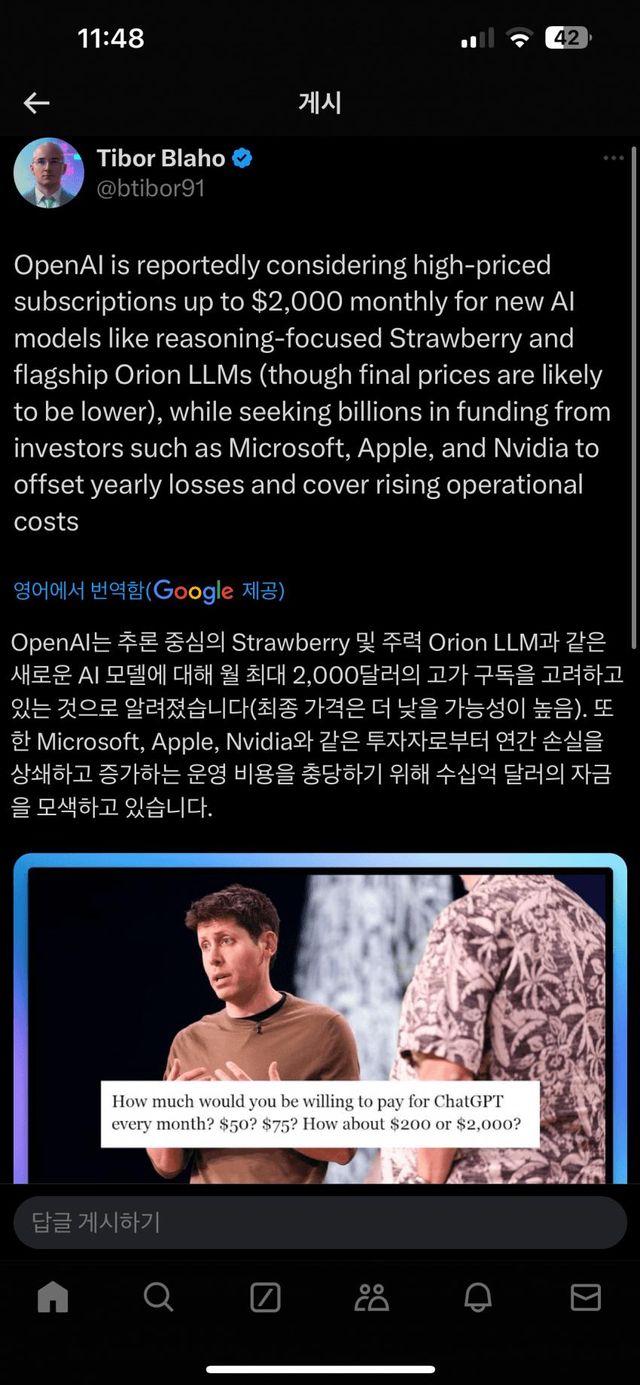 오픈AI의 게임체인저이자 준 AGI 수준일지 기대받는 차세대모델 스트로베리(일반) 및 오리온(경량) 모델에 월구독 요금으로 2000달러를 고려하고 있다는 충격적인 소식이 전해짐..이건 지금 CHATGPT 구독요금의 100배에 달하는 금액임.