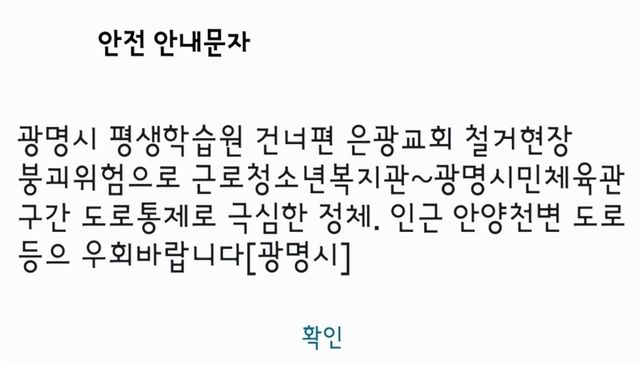 광명시가 20일 오후 발송한 재난문자(안전 안내문자) 내용. 광명시는 "광명시 평생학습원 건너편 은광교회 철거 현장 붕괴 위험으로 근로청소년복지관~광명시민체육관 구간 도로 통제로 극심한 정체. 인근 안양천변 도로 등으로 우회바란다"라고 전했다. / 광명시 제공