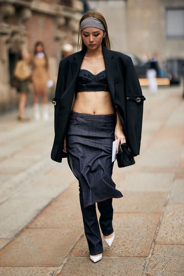 과감한 스타일에 도전하고 싶다면 브라톱이나 크롭 톱과 함께 보다 강렬한 무드를 연출해 보세요.