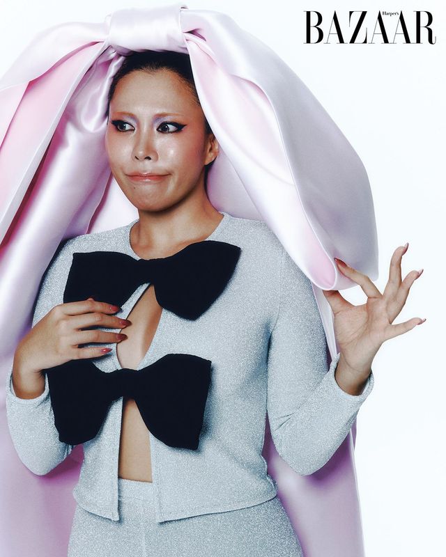 퀸가비 한국에서는 첫 화보인데 일단 〈바자〉가 엄청 신경 써준 것 같아서 감동했다고 얘기하고 싶어요. 사실 지금까지는 하이패션 오트 쿠튀르 화보를 찍었죠. 그런데 오늘은 갑자기 요란한 옷들을 입히고 특이한 포즈를 요청하셔서 살짝 당황했다, 하지만 그래도 좋은 추억이었다고 얘기하고 싶어요. Thank you.