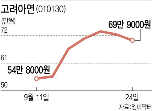 고려아연의 주가는 이달 초까지 50만원대를 유지하다 지난 12일 MBK가 다음 달 4일까지 고려아연 경영권 확보를 위해 주당 66만원에 공개매수 계획을 밝힌 이후 폭등해 24일 현재 70만원 안팎 수준에서 거래되고 있다. 시장가가 공개매수 가격보다 높아 시장 매각이 현재로선 유리하다.