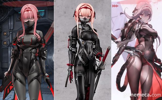 ▲ 승리의 여신: 니케 특수 개량 양산 개체 A 수정 전 모습(좌)/neco 작가의 펄스랜더 사무라이 피규어(중앙)/승리의 여신: 나케 '홍련: 흑영'(우) (사진출처: 게임 내 캡처/아마존 공식 페이지/홍련: 흑영 니케 모션 뷰 영상 갈무리)