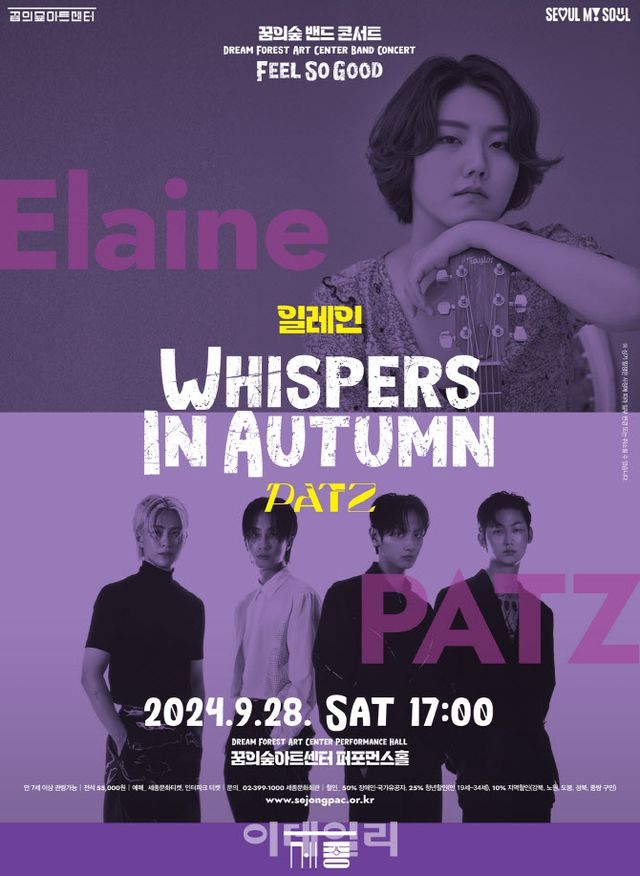 이번 공연은 감성적인 보컬과 뛰어난 연주 실력을 가진 인디 뮤지션 일레인, 파츠(PATZ)의 무대로 꾸며진다. 봄, 가을, 겨울 총 3회 릴레이 콘서트로 구성된 ‘꿈의숲 밴드 콘서트’ 시리즈 일환이다.