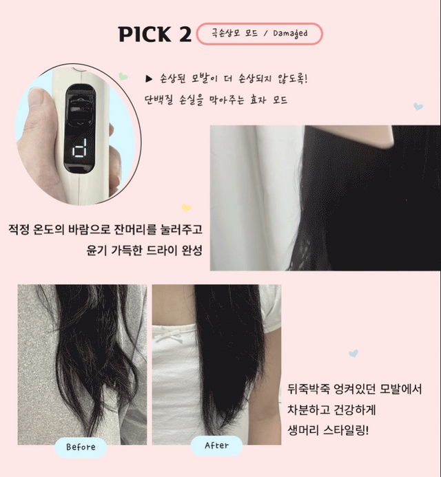 모발 속 단백질이 뜨거운 온도에 닿으면 손상되어 모발이 푸석푸석해지고 끊어진다. 하지만 극손상 모드에서는 적당한 온도의 바람으로 모발 속 단백질이 손상되지 않도록 잘 잡아준다.