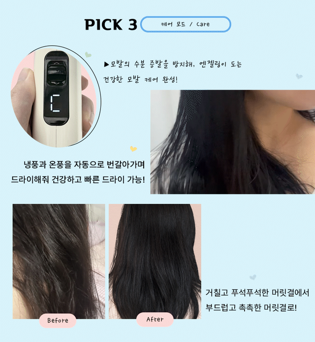 고데기 할 때 가장 중요한 건 바로 열을 식히는 것! 그래야 처지지 않는 컬링이 완성된다고 한다. 유닉스 듀얼모션의 케어모드는 냉풍과 온풍을 자동으로 번갈아 가면서 드라이해 주기 때문에 열을 주고 식히는 과정이 수월하고 탱글탱글한 웨이브를 연출할 수 있다.