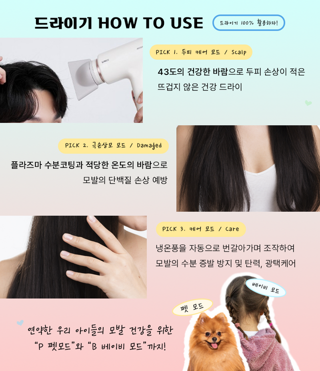 에디터는 집에 강아지와 아기가 있지 않아서 평소 두피, 극손상모, 케어 모드 세 가지를 즐겨 사용하지만 강아지와 아기가 있는 집에는 더 유용하지 않을 수 없다.