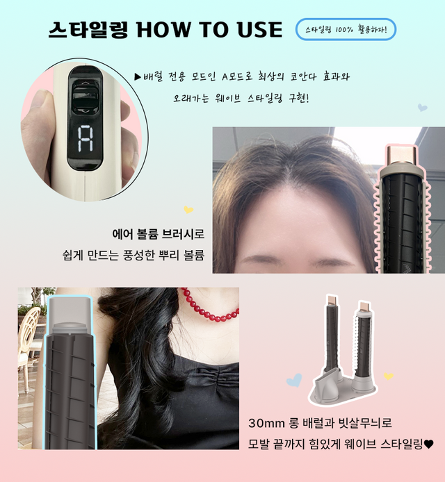 머리를 어느 정도 건강하게 말렸다면, 이제 원하는 스타일링을 연출하면서 마무리하면 돼. 배럴 교체 후 A 모드로 전환하고 모발에 갖다 대기만 하면 끝! 이렇게 간단할 수가!?