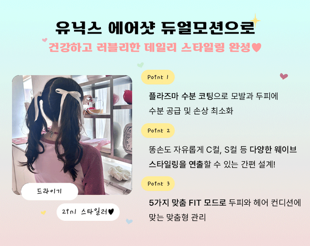 먼저 헤어드라이기 기능을 살펴보자면 유닉스 듀얼모션 헤어드라이기는 단순한 뜨거운 바람, 차가운 바람이 아니다. 무려 5가지의 케어모드가 있어 내 두피와 모발 상태에 맞게 맞춤형 fit 모드로 사용할 수 있다.