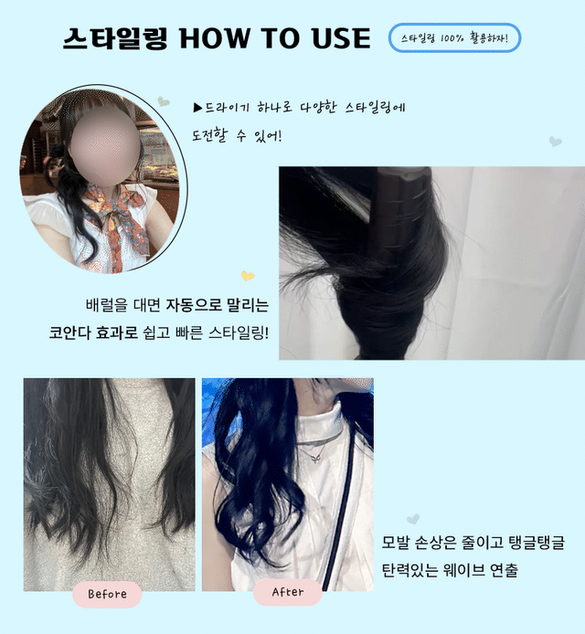 게다가 머리카락을 바람을 통해 감싸주며 컬링을 해주는 거라, 손으로 잡고 있을 필요도 없이 간단하게 웨이브가 완성! 지금까지 에디터가 자주 사용하는 세 가지 모드를 소개해 봤다. 그 외에도 펫 모드, 베이비 모드가 있으니 아이가 있거나 강아지가 있는 가정에서도 더 잘 활용할 수 있을 것 같다.