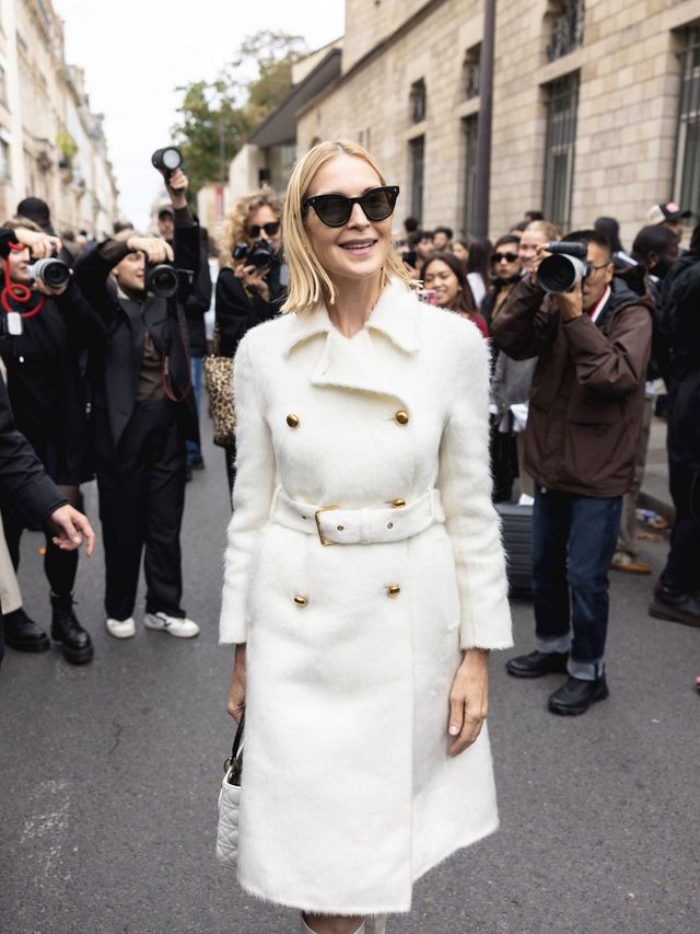 디올의 2025 S/S 컬렉션을 보기 위해 파리로 간 켈리 러더포드. 반짝이는 금색 단추가 시선을 사로잡는 화이트 코트에 순백의 레이디 디올 백과 롱 부츠를 매치하고, 프레임이 큰 선글라스로 세련된 분위기를 연출했습니다.