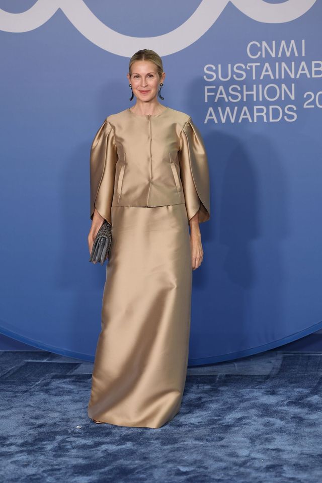켈리 러더포드가 밀라노의 스칼라 극장에서 이탈리아 패션 협회(CNMI)가 주최한 지속 가능 패션 어워즈에 참석했습니다. 골드 빛의 실크 드레스는 환경친화적인 소재로 제작된 제품입니다. 자연스러운 광택과 유려한 라인 덕에 켈리 러더포드의 고급스러우면서도 품격 있는 스타일을 더욱 돋보이게 했죠. 구조적인 주얼리와 우아하게 올린 헤어 스타일이 미니멀한 룩을 군더더기 없이 마무리했습니다.